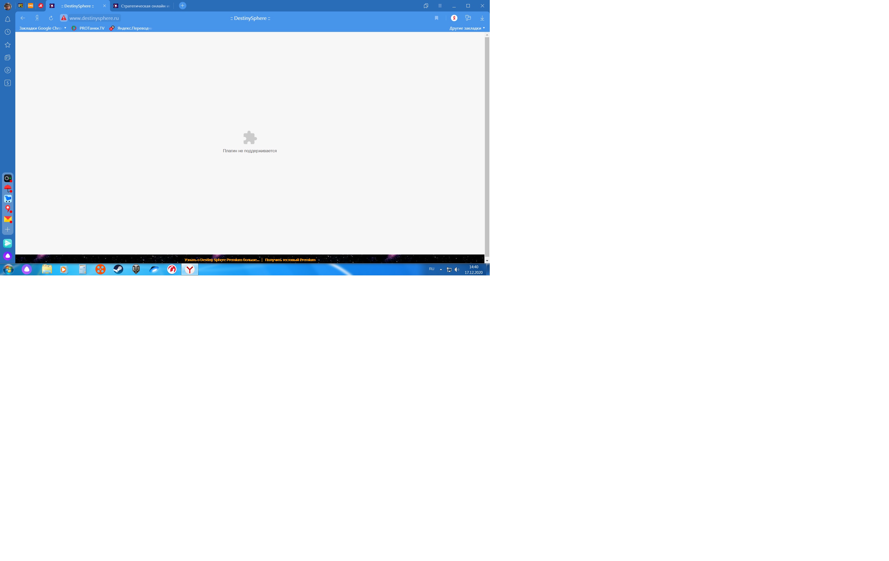 После нового года большинство браузеров планируют отключить Adobe Flash. Чтобы продолжить играть в Сферу Судьбы рекомендуем установить браузер Atom, в котором поддержка Flash сохраняется.